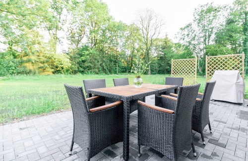 Let your soul dangle in the originally romantic location with uninterrupted views over the meadows. On the idyllic terrace, you can enjoy the evening with a glass of wine and feel why we feel at home here in the holiday Wesermarsch.