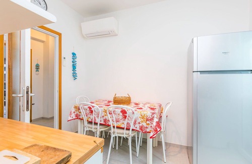 The apartment is equipped with top-notch amenities to ensure a comfortable and convenient vacation experience. It features air conditioning, a washing machine, dishwasher, heat available, microwave, and television. The maximum capacity is 6 guests, with 2 bedrooms and 1 bathroom. The kitchen is fully equipped with an oven, dishwasher, 4 induction hot plates, toaster, kettle, microwave, and electric coffee machine, providing ample space and appliances for meal preparation. There is also an exit leading to the veranda from the kitchen.