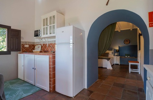 This vacation apartment is the perfect child-friendly vacation spot for families with children who like to spend an active vacation. As part of a farm, the apartment charms with a cozy sofa corner in front of large windows overlooking the lovely countryside. Have a nice rest here when you need a break from the all-enveloping heat. Conjure up delicious dishes in the kitchen to enjoy on the veranda. After breakfast, blow up the bath animals and relax in the large pool to the song of the cicadas. There is no room for boredom here!