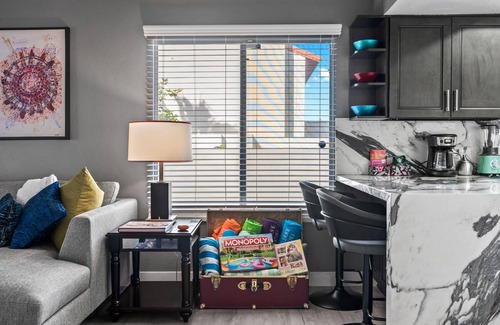 Re-energize and relax with your stay at this remarkable one-bedroom (sleeps 3) condo conveniently located just an easy walk to beautiful downtown Palm Springs. This unit has been fully renovated from top to bottom with a new fully stocked kitchen, high end custom finishes, new furniture, wet bar and custom paintings, commissioned specifically for this space, by local Palm Springs artist Mark Hollenstein. Beautiful mountain views abound from the expansive veranda which also serves as an outside living & dining room and has steps that lead directly down to multiple heated pools and hot tubs waiting to relax you. All are located within a professionally designed and landscaped courtyard. The association members are welcoming to renters and owners and host monthly social hours/activities for you to enjoy while basking in the desert sunshine. To top it off there is a free covered parking spot in the gated and secure lot and an in-unit laundry. It’s time to relax and enjoy the comforts of this beautiful home that has been intentionally created to provide a peaceful oasis in the desert sunshine.