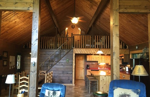 Inside you will find a 2 story vaulted open great room with a spacious dining room and fully stocked kitchen with a 10 foot island. There is an enormous wall of all windows looking out to the river for an open view. The cabin has knotty pine walls, a full brick wall fireplace and rustic cabin décor. There are 3 bedrooms and 2 bathrooms (one full and one ¾ bath). The master bedroom has a King-sized bed with bathroom access. The second bedroom has a queen bed and twin bed with bathroom access. The 3rd loft bedroom overlooking the great room and river has 2 twin beds. There is also a queen size futon. Linens and towels are provided.