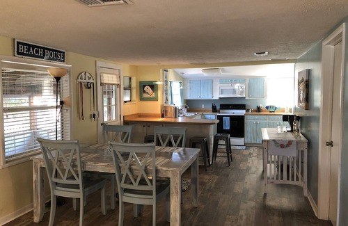 The home has a nautical theme with vinyl wood like floors throughout, white distressed furniture and beautiful wall hangings. It sleeps up to 6 people with 2 full baths. There are 2 bedrooms, and a queen size air mattress. The kitchen has everything you need, including , toaster, 1 cup pod coffee maker, microwave, blender, and crockpot. Plenty of pots, pans, dishes, wine glasses, cooking utensils, eating utensils, and plastic containers with lids. The table sits 4 and the bar sits 3 in the kitchen. There is also a washer and dryer.