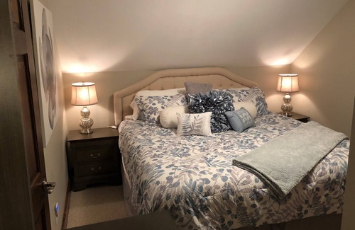 This newly remodeled 750 square-foot carriage house will provide you with your own separate "Home Away From Home" as you socially distance yourself from an uncertain world. Just across from the owner's home, it is your "City House in the Country". With 7 acres, many mature trees, a pond and quiet seclusion well off the road, you will feel like you are out in the country. It features a cozy bedroom with a pillow-top king bed, living room, full kitchen with quartz counter tops and stainless appliances. Custom bathroom with ceramic/mosaic tile, including washer and dryer-- it will provide you with everything you need for a comfortable stay. Bonus space included: Downstairs office / living space with queen size futon bedding included. An attached 1 car garage is also included. Parks for walking and biking are close by. A great escape nest for your getaway stay!