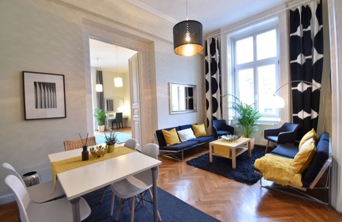 Very nice, sunny and spacious 9 bedroom apartment with 4 bathrooms. Flat benefits from 4 meter ceilings and wooden flooring with large floor to ceiling windows. Two balconies overlooking the Grand Blvd . Ideal for families or large groups. Open plan kitchen/living area with all modern conveniences. Great location from which to explore Budapest.Right at Grand Blvd, and Radisson Hotel. Flat benefits from a large terrace outside.