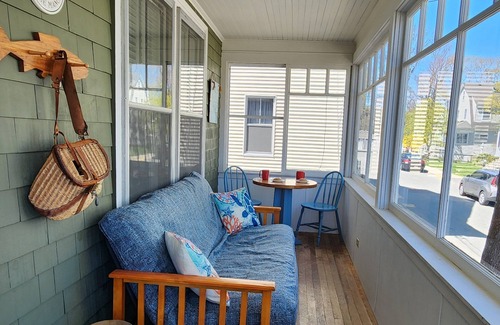 The front of the house features a wonderful enclosed porch with a bistro table/chairs, rocker and futon. Perfect for morning coffee or an afternoon nap. The soft sound of local seagulls is often present.