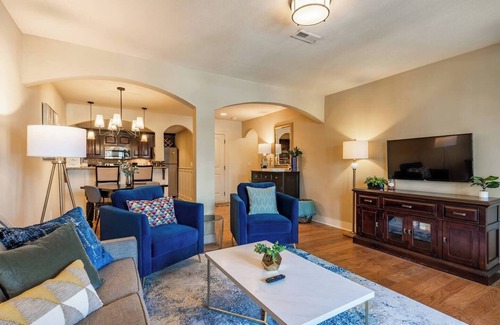 Welcome to our charming 2-bed, 2-bath condo in KC's vibrant Plaza district! Whether here for work or play, enjoy comfort and convenience. Relax in the stylish living area with ample seating. The open floor plan connects living, dining, and kitchen—perfect for socializing and relaxation!