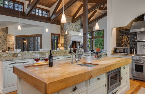 With its exquisite stone exterior and private wooded location, this luxury home is a welcoming and stunning retreat with its brick driveway, expansive living spaces, and beautiful gardens. Spanning over 6000 sq. ft. with beautiful deck spaces and views, this home sleeps 12 with 6 bedrooms and 6 bathrooms.