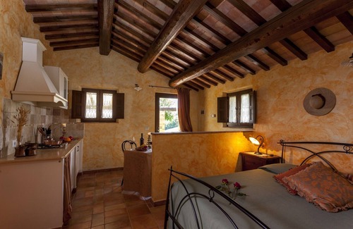 Single cottage in the Marche on one level completely independent, renovated in 2005, inside an ancient manor house, the romantic studio flat "IL MELOGRANO", furnished with care and style, located on the ground floor, has a double bedroom and bathroom with hydromassage, It is also equipped with independent heating, kitchenette, satellite television, a private veranda with table and chairs and everything you need to spend a pleasant romantic weekend in a farmhouse.