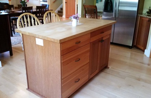 The kitchen features a walk-in pantry, granite countertops, and stainless appliances, including a five-burner Dacor gas cooktop, microwave, and convection oven. There is a maple butcher-block kitchen island with two bar stools for informal eating and chatting with the cooks. The kitchen is well equipped with dishes, silverware, cookware, utensils, condiments, and spices.