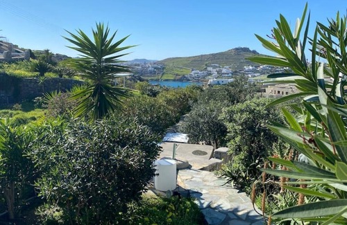 The house is only five minutes from Mykonos old town and overlooks Ornos beach. It has a large outside jacuzzi and three bedrooms with en suite bathrooms and can sleep six guests. The house is in a great position close to Mykonos town and all the wonderful beaches. Incredible views of Ornos bay and spectacular sunsets from your lovely private garden. The house is less than 1km from 2 supermarkets and 4 great restaurants. A bus stop is close to the house for the old town and beaches and there is an on-site mini-bus service which will take you anywhere on the island for a fair price. This bright and comfortable home is built on three levels. Upon entering, you will find an open plan cozy living room and fully equipped kitchen with french doors that open to the garden and outdoor dining areas. Upstairs you will find the master bedroom with a private bathroom en suite and a generous outdoor terrace which overlooks the beautiful gardens and valley below. Downstairs are two additional spacious and bright bedrooms each with their own bathrooms en suite. One bedroom features two twin beds and the other a double bed. Also located on this floor is a fully equipped laundry room with top of the line appliances including a washing machine and dryer which you may use during your stay.
