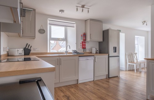The hall way (left) takes you to the kitchen / dining room which lends its self to a large dining room table and chairs suitable to sit up to 8 people. Again, there is a wall mounted TV with SKY and internet TV. The kitchen has a dishwasher.