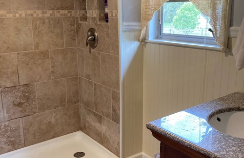 The main level of this historic cabin has a sunporch that allows viewing of deer as they graze in the pastures. There is a kitchen, dining room and comfortable living room with flat screen TV (Dish). 2 comfy recliners and fireplace. Queen bedroom and sitting area. The front door opens onto a porch with antique rocking chairs.. There is one bath with shower on the main level.