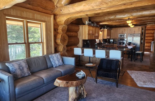 This property is a spacious unique custom built four season hand scribed luxury log home built on 2.5 secluded acres with a private sand beach, large lakeside manicured lawn, campfire area and boathouse/bunkhouse. Home is located right on the snowmobile and ATV Trails! 5,400 Sq Ft with 4 Bedrooms (includes 2 primary suites) plus Den, sleeping 12 with 5 bath, large loft and separate bunkhouse at the waters edge on the beach; sleeps 2. Theater style media TV, sauna, pool table, game tables, satellite TV, Netflix, Wi-Fi, washer & dryer, 50' dock, fish cleaning table. Full gourmet kitchen with all service and bar wear and full linens and towels provided. The home is located at the far West end of Big Bay which offers secluded calm waters with minimal wind perfect for fishing, jet skiing, waterskiing or tubing as well as rafting boats to the dock.