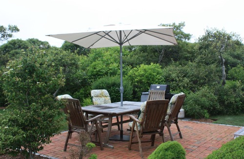 At the end of it's own private white driveway, landscaped gardens provide seclusion and peace to relax at this newer Nantucket home. The acre lot accommodates spacious outdoor living and lawns for children to play safely. The brick patio is perfect for dining and barbecuing, it is accessed from french doors off the living room.