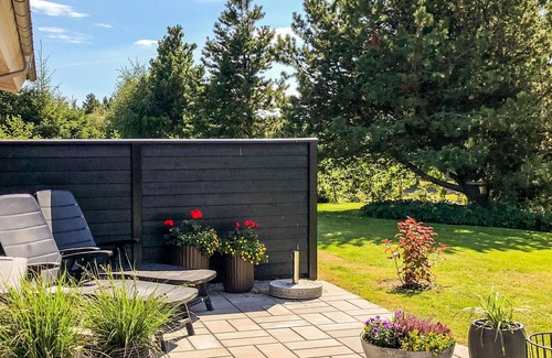 In a beautiful vacation home area, not far from the harbor town of Hals, this bright and appealing house welcomes you. It is the perfect place to take a break from your hectic everyday life and enjoy the benefits of the homely ambience. The open-plan living area, with high ceilings, large panoramic windows and good, well-maintained furnishings, promises you plenty of time for cooking together, playing games at the dining table or movie nights on the sofa. A whirlpool bath is available for relaxing hours of wellness.