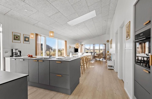 Your spacious holiday home on Løkken Strand, with room for at least two families, offers you the ideal blend of comfort and Scandinavian cosiness. Start the day in a relaxed manner with a cosy breakfast at the spacious wooden dining table, while you let your gaze wander through the large windows into the surrounding nature. Or enjoy your meal outside on the spacious terrace, which is ideal even in changeable weather thanks to the protective wooden roof. You can easily prepare your meals in the open-plan, modern kitchen.