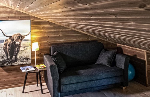 Spend an unforgettable vacation in the nature of Norway together with your extended family. The house is beautiful and equipped with everything you want for your carefree vacation. Make yourself comfortable here, enjoy the fireplace and look out into nature and the nearby lake. You can also settle down in the sauna after active days or on the veranda with a warm drink in your hand. The house has a canoe that you can use.