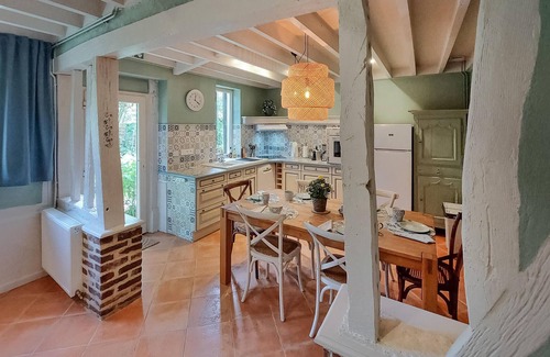 This vacation home welcomes you to the village of Thierville in the Risle valley. The former farmhouse has been lovingly restored and welcomes you to a comfortable vacation in an authentic atmosphere. The cozy living room with open kitchen forms the heart of the house and invites you and your loved ones to spend many convivial hours together.