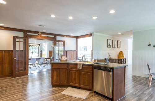 - Kitchen: Oversized, fully equipped kitchen with cherry cabinets, an island, kitchen table for four, and tons of amenities for cooking big family meals. Coffee machine, waffle maker, blender, etc. A small porch off the kitchen has seating to overlook the backyard.