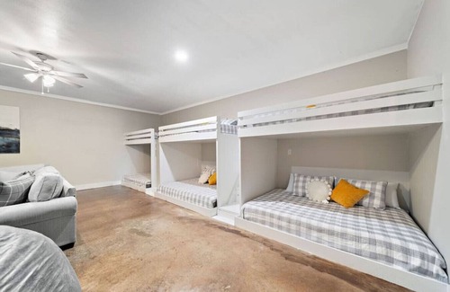 Just off the kitchen, you'll find a versatile game room offering double the fun! Challenge your friends and family to classic arcade games or relax on the comfy seating and catch a movie on another big-screen TV. This room cleverly transforms into a sleeping space with three full-over-queen bunk beds along the back wall, perfect for kids or extra guests. For added convenience, a half-bathroom is located just off the game room, perfect for avoiding upstairs trips during playtime.