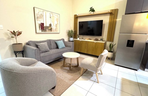 This single-story home combines elegance and comfort, offering three spacious bedrooms with A/C to accommodate six guests, a fully equipped kitchen, a terrace with a grill, two Smart TVs, a washer and dryer, a covered garage for two vehicles, common areas with a pool, green areas, lounges, and 24-hour security.