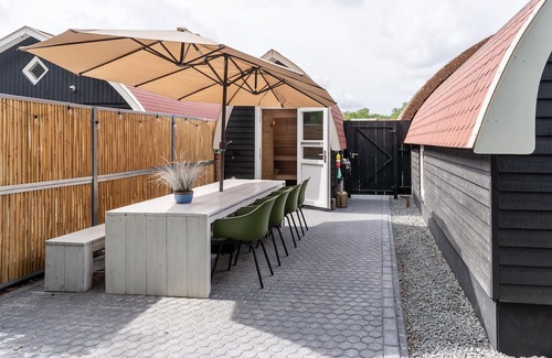 This modern holiday home is located in a small-scale holiday park, in the middle of the forest. Due to the shape of the partly thatched roof, this accommodation has a special appearance, both outside and inside. The holiday home is suitable for up to four adults and two children and features three bedrooms. One of the bedrooms has a bunk bed (for children). The living room with open plan kitchen features a comfortable sitting area and a spacious dining table. Perfect to spend some quality time together. On nice days, you can open the French doors and also enjoy the terrace with garden furniture. This accommodation is equipped with a lovely sauna. At this holiday park, you can also book other accommodations for various groups and in various locations.