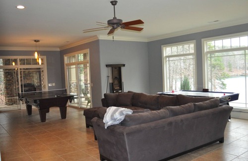 Beautiful 5 bedroom Lake Keowee lakefront home located on a quiet cove with expansive water views in The Reserve at Lake Keowee. Open floor plan with state-of-the-art kitchen and amazing lake views. Deck off dining area has commercial grade grill and wood burning fireplace with overhead television. Main level family room has 55" television and gas fireplace. Main level has Master bedroom and 2nd bedroom, each with en suite bath. Lower level has 2 guest rooms with queen size beds, one of which has en suite bath. Second lower level bathroom is across the hall from bedroom. Lower level family room with pool table, air hockey and 75" flat screen television with theater sound system. Oversized 5th bedroom has 4 full size beds, 55" television, walk-in closet and full bathroom. Gentle sloped walkway with NO STAIRS to sitting area, fire pit, dock and water. Close to Clemson, Seneca and Greenville.