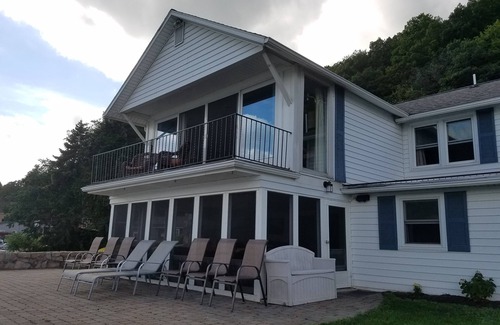 This 1600+ square foot private home has 126 feet of Keuka Lake frontage with permanent docks for your enjoyment (covered lift and hot tub not included in rental). Fish and swim right off the docks. Comfortably sleeps 8, with 3 bedrooms and two full baths. Remodeled kitchen has all major appliances and utensils needed! New central air conditioning and heat. Stunning lake views from both floors. Drive right to front door, no lugging groceries and bags down steep stairs! Upper floor has newly remodeled kitchen, 2 bedrooms with queen beds, full bathroom, dining room and living room with fireplace, queen sleeper sofa, and sliding doors to an upper deck. Bar with extra full size fridge on lower floor, along with family room with queen sleeper sofa, laundry, full bathroom, bedroom with double bed, and large three season room with huge windows on three sides that transform the space into a screened porch. Large outside patio has hightop table and chairs with new firepit for enjoying the gorgeous sights and sounds of pristine Keuka Lake. Propane grill on the flat lawn area great for bocce ball, corn hole, and other lawn games!