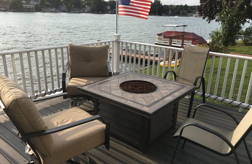 32 foot wide composition (trex) deck with gas fire table. Deck leads to 50 foot wide water front concrete patio. And private dock.