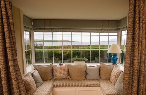 This cottage has been lovingly renovated to a high standard and recently repainted with great appliances, heating, bathrooms and lovely fabrics and colours making it incredibly warm and comfortable. The views are southerly over the sea and the situation is absolutely stunning and extremely desirable. The cottage is available to rent directly from the owner and it is much more of a 'home' than a 'rental cottage' filled with the comforts you would expect. A short shared driveway leads you up to a small gate through which you will find Kildavannan Schoolhouse and garden. The downstairs consists of a large living area with a window seat, television (freeview not sky! ) and a working fireplace. Fabrics such as colefax and fowler adorn the cushions, blinds and window seat and a handmade leather chair sits beside a very large sofa which will comfortably seat 6 adults. There is a conservatory with more beautiful views that seats four comfortably and can get extremely warm in the daytime. Dark terracotta tiles cover the kitchen floor and new appliances such as separate clothes washer and dryer, dishwasher, large fridge freezer and anything you would sensibly require for a kitchen is available.