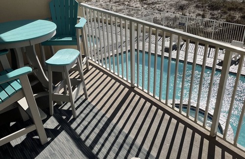 Clean and comfortable 2nd floor unit and steps away from the sand! Clean, easy access, perfect for couples or for small families! Beautiful view of the Gulf Coast! Only one flight of stairs from ground floor! DOES have and elevator! Steps from the beach. Enjoy the Amazing Sunrise and Sunsets! 1BR, 1BA, Sofa Bed, and Cove Bunkbeds on 2nd floor, sleeps 6 comfortably! Smoke Free Small building (36 Units), Restaurants in walking distance. Beautiful panoramic views of the Gulf Coast!