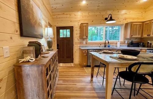 Escape to your own charming BRAND NEW mountain top paradise! . Located on 56 acres, the property is ideal for enjoying nature walks and/or hiking down to the bustling creek. Leave your busy life behind to sit and relax on the covered back porch and enjoy the expansive views of the North Carolina wilderness. This cozy open concept cabin sleeps 6 and comes complete with 2 bedrooms, 2 full bathrooms, a full eat-in kitchen, and laundry room. It features rustic wood paneling with modern accents, and gas fireplace. The large back porch adds to the living space and is ideal for outdoor dining or just enjoying the views. The property also features a BBQ grill onsite as well as a firepit to enjoy the cool evenings. WIFI is available.