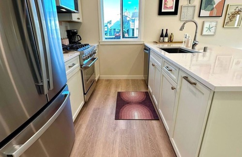 **KITCHEN:** This fully equipped kitchen is a dream for any home chef, complete with stainless steel appliances, an island with seating, a coffee maker, blender, kettle, slow cooker, dishware, flatware, an ice maker, a toaster, spices, and more. It has everything you need to prepare and enjoy meals with your family, allowing you to feel comfortable and at ease during your visit.