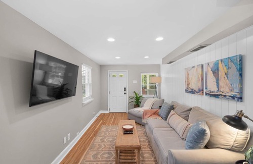 Kick back and relax in this calm, stylish space! No details were spared in the latest renovation to Maura & Pete's Airbnb properties. From the moment you walk in you will be overwhelmed with the tremendous comfort in the living room leading to a kitchen well equipped with your cooking needs. Along the way there is a washer & dryer if needed. Upstairs you will find a gorgeous bathroom right next to a perfectly laid out bedroom w/ plush king bed where you can watch your favorite show on the HD TV!