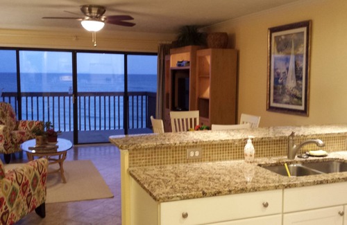 Come relax and enjoy this beautiful and tastefully decorated 3rd floor (top floor) Oceanfront 2 bedroom, 2 bath condo centrally located at Sea Colony which is one of the nicest, most quiet spots on the beach. It is close to wonderful restaurants, Britts donuts, The Tiki Bar, and all attractions such as the Kure Beach pier, the Carolina Beach boardwalk, Ft. Fisher, the N.C. Aquarium, the ferry to Southport and to beautiful, historic Wilmington. Watch the sun come up from the master bedroom and take in the sights, sounds and smells of the surf as you suntan, dine or simply unwind on the very spacious deck overlooking our beautiful coastline. The en-suite master bedroom overlooking the ocean has a comfortable king bed and the second bedroom has a queen bed with access to the second bath. That bathroom may also be accessed off the hallway. There is also a queen sized sleeper sofa in the living area so the condo can accommodate 6 people comfortably. Please note guests are responsible for bringing or acquiring their own sheets and towels. The newly redone cottage style kitchen has granite counter tops and a gorgeous view of the ocean. There are TVs with cable in the living area and in the master. Wifi, washer, dryer, dishwasher, A/C and ceiling fans all help to make your stay more comfortable. There is parking for two cars using the guest parking passes in front of our elevator building. There is also a lovely pool and grills are available on the large grass lawn. Please note that my condo is not listed on Craigslist. With all that being said, Welcome, I hope you find this charming place as comfortable as I do. Come smell the fresh sea air, feel the breeze and let the sound of the surf relax and renew you. Enjoy!!