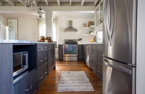 In the cooler months relax by the wood burning stove while prepping dinner in the fully stocked kitchen.