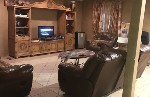Guests are sure to enjoy a memorable vacation in this fully furnished, 4 bedroom/2.5 bath house on a ranch.The main/master bedroom has a queen-sized bed, while the 3 remaining rooms are furnished with queen-sized beds, comfortable for sleeping 8 people.The spacious living room is furnished with 3 couches and an entertainment center with TV. The kitchen is perfect for dining as it is equipped with an oven, 2-door refrigerator, dishwasher, and large dining table. Situated on a large land in the country ,guests can enjoy peace and quiet. Can accommodate horse trailers. HORSES ARE WELCOME.
