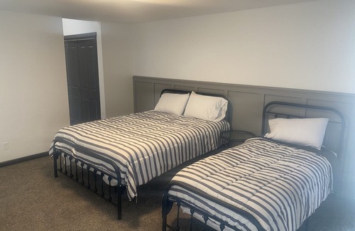 Large open room to relax with your family or friends. Very quiet neighborhood and close to everything you need in town. One bedroom has a king bed and the other bedroom has a queen and twin. The kitchen is fully stocked and ready for you to use!