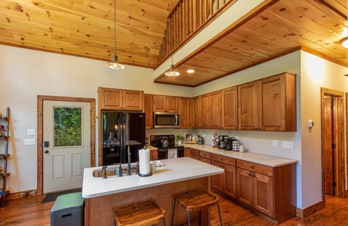 The kitchen is complete with new Whirlpool electronics and is stocked with pots/pans, flatware, grilling utensils, measuring cups, cookie sheets, cutting boards, can openers, a toaster, and an instant pot. We also provide a Keurig with k-cups and a drip coffee maker (We do not provide any coffee for the drip coffee maker). You can enjoy your home cooked meals at the kitchen counter (seating for two) or at the kitchen table overlooking the forest (seating for four).