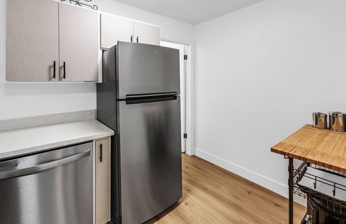 kitchen boasting a full fridge, stove, dishwasher, microwave and coffee maker.