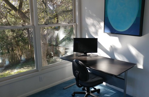 The studio backs up to a greenbelt and is very quiet and private, like living in a nature preserve. You will see deer and squirrels everyday, bunnies, armadillos and an occasional fox. The apartment is below our house with a separate gate and entrance. There are steps and a stairway that separate your studio from the street. You share the extensive backyard and pool with us. We are low keyed, quiet types, working remotely and have a friendly inside dog who visits the yard.