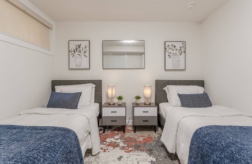 This cozy and newly developed basement suite has 2 bedrooms, the 1st bedroom has a queen size bed, and the 2nd bedroom is fitted with 2 twin size beds. The living room has a modern and ultra comfortable sofa and there is a baby “pack and play” pen in the suite at all times for the very little ones. The suite has spacious interiors with a modern kitchen fully equipped with a full stove, basic cooking and baking ingredients and adequate utensils, a full-sized fridge, toaster, coffee maker etc. and tons of storage. It has a 3-piece bathroom and a dedicated office/workspace for a quiet time to read, work and respond to those emails! The suite has a private entrance and a dedicated biking and walking path right behind the property. It is located on a quiet street in the luxurious and central community of Cougar Ridge just minutes from Downtown and local amenities plus easy access to the highway for quick escape to the mountains - Banff, Canmore, Kananaskis etc.