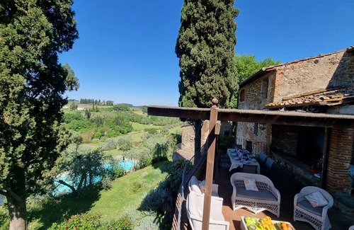A charming historical Chianti home on a wine & olive farm; a beautifully refurbished "frantoio" that once housed the ancient olive press. The house has 7 bedrooms on 2 floors, 6 bathrooms, 2 kitchens, 2 sitting rooms and a veranda overlooking the Tuscan hills. The property has its own private swimming pool and outdoor dining area. The local village of San Casciano Val di Pesa is 3min drive away with charming shops and restaurants. Florence is 20 min away, Siena 45 min and Pisa 1 hour.