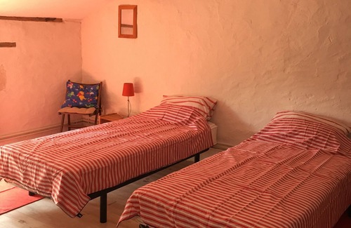 However, the view from the kitchen window over the cornfield to hills beyond ensures that even time at the sink can be a pleasure. Beyond the pretty bread oven at the back of the kitchen is the suitably large utility room where guests will find a freezer, washing machine and tumble dryer. The dining area leads into the lovely lounge where all guests can relax and make use of the ample books and games that are available or just sit and watch the television. There is also a DVD player. If visiting outside of the summer season it’s possible to use the wood burning fire which will ensure days and evenings remain warm and cosy. The downstairs double bedroom is situated at the back of the lounge and has an en-suite shower, bath, sink and toilet. There is also a walk-in wardrobe. The room has the added benefit of having French doors that open directly onto the courtyard.