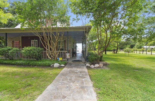 Our classic comfortable home on 1.7 acres nestled among mature trees and green grass will give you that away from the city feel. It sits on the water, in a private cove. The open living area and nice screened in porch gives room for comfort away from the elements. If you are looking to stretch your legs this is the place for you. the Roadhouse boasts amazing outdoor spaces and room to roam. The fully equipped kitchen and outdoor kitchen are exactly what you need for no-fuss cooking. A full bathroom sits between two bedrooms each with queen beds on the first floor. Upstairs, the Master loft has a king-size bed and private en-suite with a walk-in closet and freestanding tub. There is a futon in the living room for another sleeping option. For more than 5-6 people - the Guesthouse Hideaway is available for a fee and has mini kitchen with refrigerator, microwave, and full-sized stove, 1 king bed, 1 queen bed, and another futon for additional options. The Hideaway also boasts a full bathroom, this area is great for teen retreat or extended family who prefer a little privacy. Both areas sleep 12-14 comfortably. We have a beautiful garden that is usually blooming with seasonal vegetables. Fishing is fun and easy from the dock on the private cove. Standup Paddleboard, canoe and kayaks available at no extra fee. A nice fire-pit area for relaxing, roasting marsh mellows, or even cooking on the commercial open pit with grill grated firewood also provided.