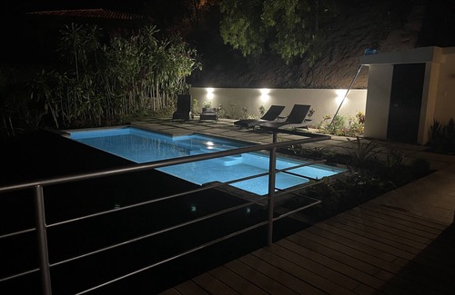 Open the front wall of sliding doors and enjoy the outside seating and dining area and the beautiful valley view as well as views of city lights in the distance. Enjoy the double bed chaise on the second deck area as well. Our 8 meter heated pool and patio area overlook the valley. The house is on 1.7 acres of natural beauty with a 180 degree view of mountains and a valley and the sound of water running from the nearby river.