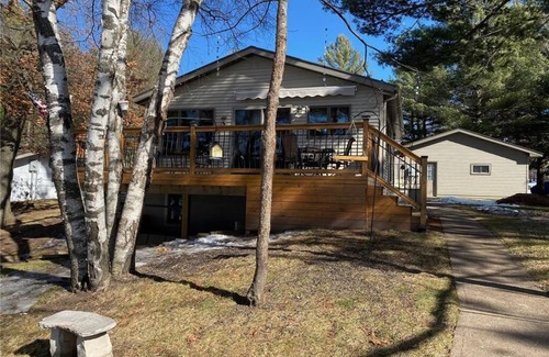 Very clean/well cared for mini-lake home with all the comforts of home. Beautiful views of Bashaw Lake, a smaller lake perfect for swimming/fishing/boating. Private beach area with swimming dock, boat dock & firepit. 2 Bedroom with additional sleeping in lower level (pull out sofa) and bunk house (finished 3rd stall of garage) with bunk bed. Deck off cabin overlooks lake and has beautiful views! Close to many nearby lakes, golf courses, trails and right between the charming towns of Siren and Spooner! Nice!