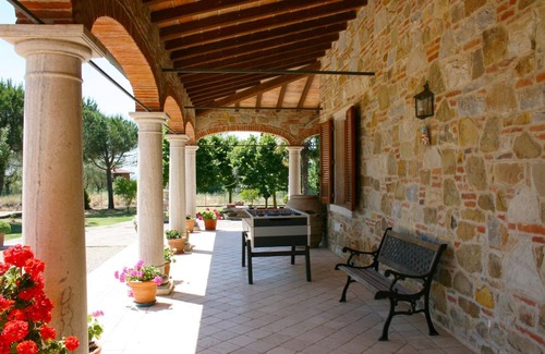 Lucignano and southern Tuscany. Villa Fosca lies on the slopes of one of the hills which face the Sienese Valdichiana and gently descend towards the valley. This beautiful house, carefully restored, is set in a panoramic and quiet position, very close to Lucignano, a village in Southern Tuscany which represents one of the most extraordinary examples of medieval town-planning. Its fortunate geographic setting in a dominant position in the Valdichiana between Siena and Arezzo has made it strategically important through the centuries. It was a medieval castle fiercely contested by surrounding territories. Beautiful villa immersed in the countryside. This beautiful villa is immersed in typical Tuscan countryside amongst cultivated fields, vineyards, olive groves and woods. Furnishing is comfortable and of good standard. All around it there is a large, fenced outside space with garden furniture and barbecue. Behind the house, in a sunny and panoramic position there is a 6 x 12 m. pool (depth 0,90-1,60 m. - open from 01st May to 30th September), for the exclusive use of clients. Close by the villa with independent entrance is the owner's house, who is completely at guests' disposal, should they require any assistance during their stay.