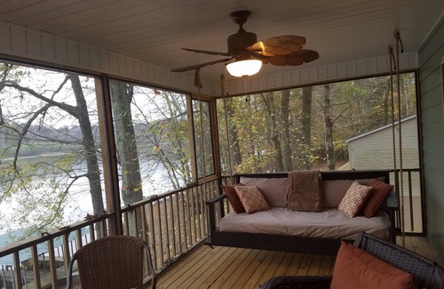 This house is a very comfortable 2 bedroom, 2 bath waterfront property. It has a large bed swing and TV on a screened in porch that allows for beautiful evenings watching the sun go down. There is plenty of room for additional air mattresses for more than four people. There is Directv and internet in the house. There is also a washer and dryer, iron and ironing board and microwave. The area is well know for crappie, bass and catfish.