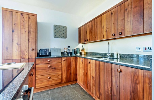 Well-equipped kitchen with fridge, freezer, dishwasher, oven, induction hob, toaster, kettle, Nespresso coffee machine with starter supply of pods, microwave and dining table seating eight